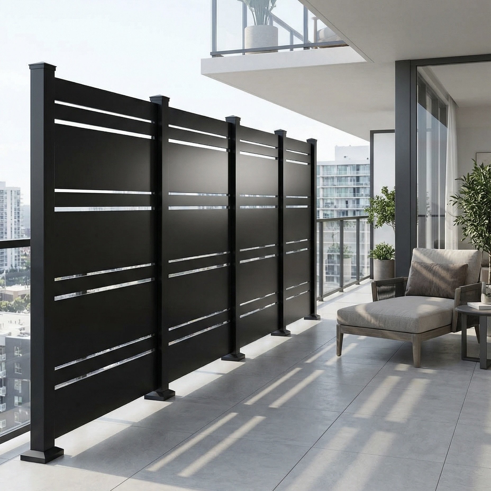 Architectural aluminum privacy screen systems for condominiums, townhomes, and mixed-use developments — ideal for balcony dividers, shared outdoor spaces, and defined boundary zones between units.