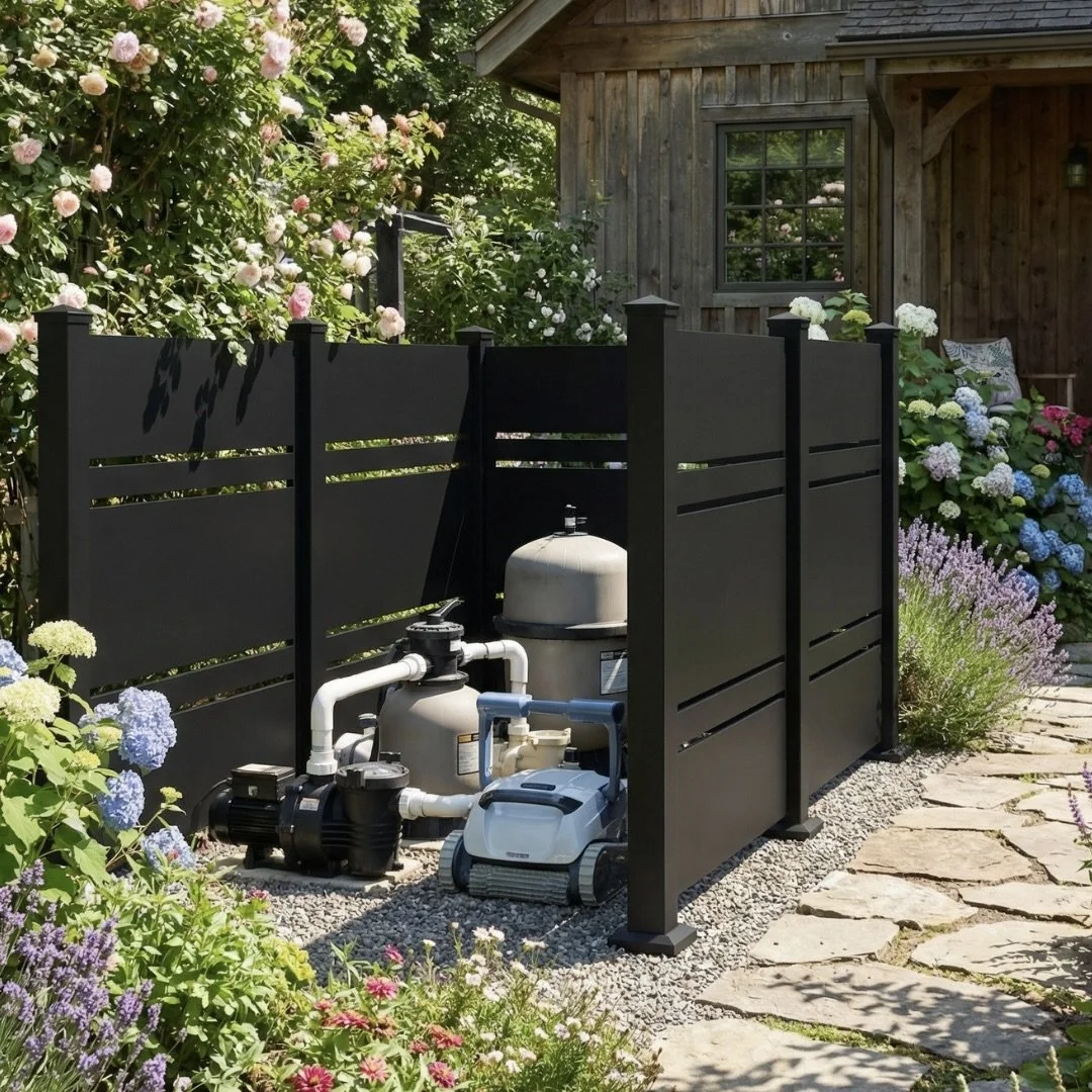 Durable screening systems that conceal pool equipment, HVAC units, and mechanical areas while maintaining airflow and a clean, integrated landscape appearance.