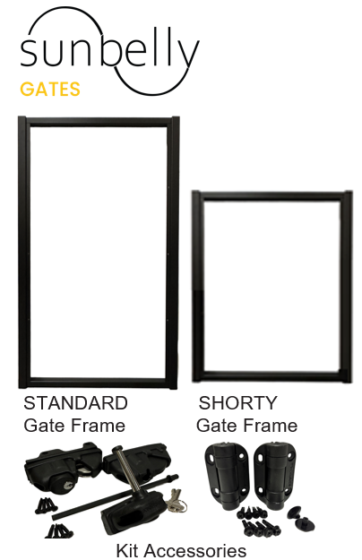 Gate Sets include frame, hinges, and locking hardware. Screens and posts sold separately. Designed to integrate with Standard and Shorty Sunbelly Screens.